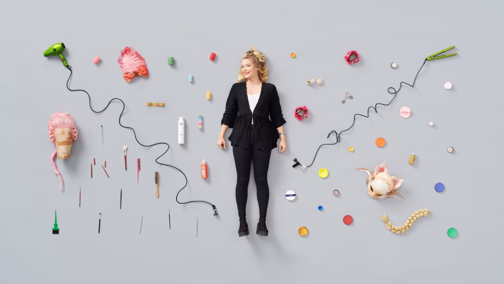 Our essential tools include hairdryers, straighteners, brushes, rollers, and hairspray, as well as powder puffs, eyelash curlers, and spatulas. In addition to this, we use make-up, glitter, and face and body paints. Face and body paints are needed for full-coverage looks but must be applied carefully: we avoid oil-based paints to prevent anyone slipping onstage. Sometimes, we also craft various types of masks by hand.