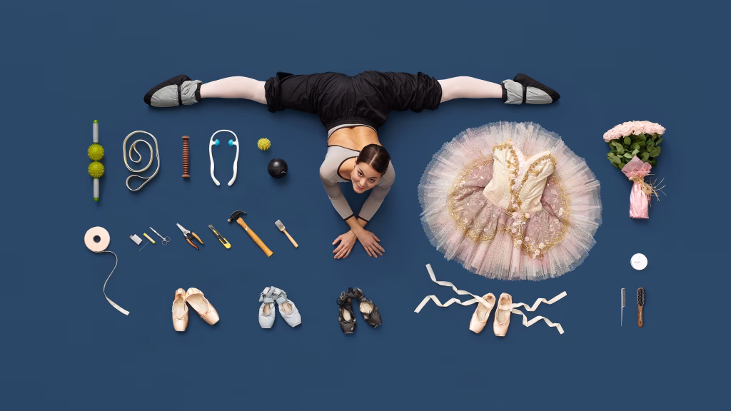 The down booties I’m wearing in the photo are part of my daily routine, keeping my ankles and toes warm during breaks and when I move between rehearsal rooms. They were originally designed for Alpine climbing, but they’re perfect for dancers too.