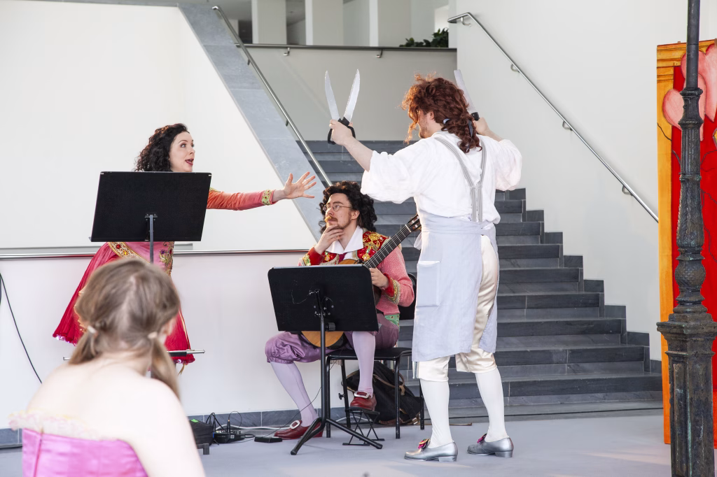 Hjälp! Rosina är i trubbel! Hon tycker om greven, men Bartolo vill gifta sig med henne. Vem skulle kunna hjälpa? Den mångsidige Figaro kallas till räddning. Följ med på en halvtimme långt äventyr fullt av fart och oväntade vändningar, allt ackompanjerat av Rossinis glada musik.