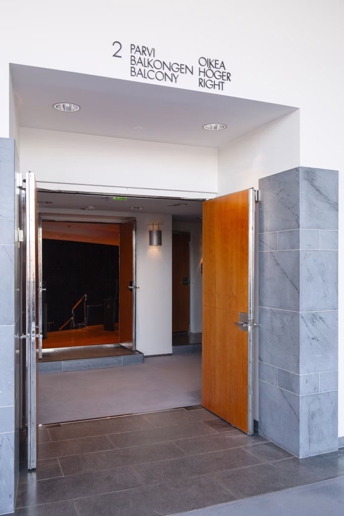 Om du använder ingången från Mannerheimvägen ligger garderoben på vänster sida sett från ingången. Du kommer till platserna med tillgänglighet på 1:a balkong genom Ainos aula till höger om champagnebaren. En hiss som går upp till balkongfoajén och ner till Alfons aula finns till vänster om champagnebaren, bredvid trappan upp till balkongfoajén.